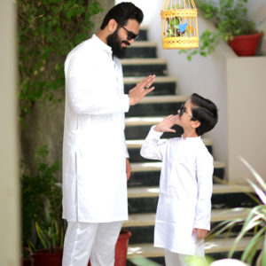 A mehndi colored linen kurtha with swiss dots throughout and paired with straight white trousers. Perfect for the hot weather!