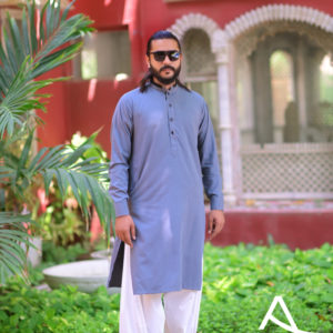 This is a simple navy blue printed suit for boys. Paired with white trousers.