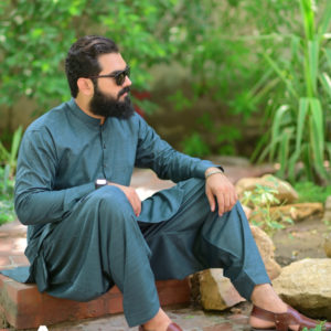 This is a white and blue chikan lawn shirt paired with a designed wide white trousers and a blue dupatta. This outfit is perfect for any special occasion!